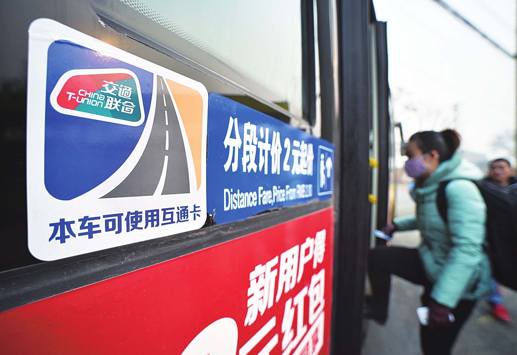 京津冀协同发展上升为国家战略两年来,土地面积21.6万平方公里、人口过亿的京津冀地区深化交流合作,在产业、生态、环保等三大领域取得重要进展。图为乘客在北京焦化厂公交站乘坐贴有“交通联合”标识的公交车。