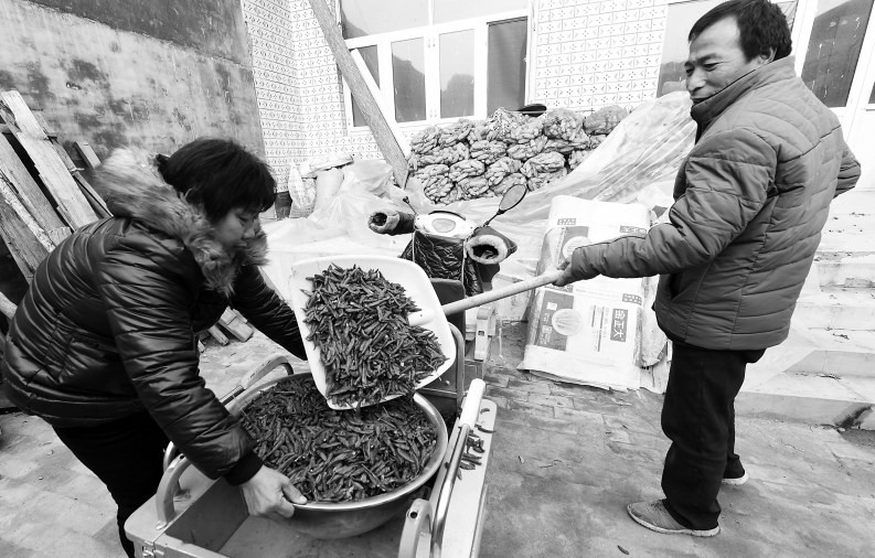 近年来,河北省武邑县结合市场需求,采用“公司+基地+专业合作社+农户”的辣椒产业发展模式,在辣椒种植户中大力推行“订单种植”。通过“订单种植”,种植户可以享受到辣椒产业公司和专业合作社在农资、种植技术指导等方面的“制式化”服务,实现稳定增收。图为武邑县赵桥镇辣椒种植户在整理分拣晾晒好的辣椒。李晓果/摄