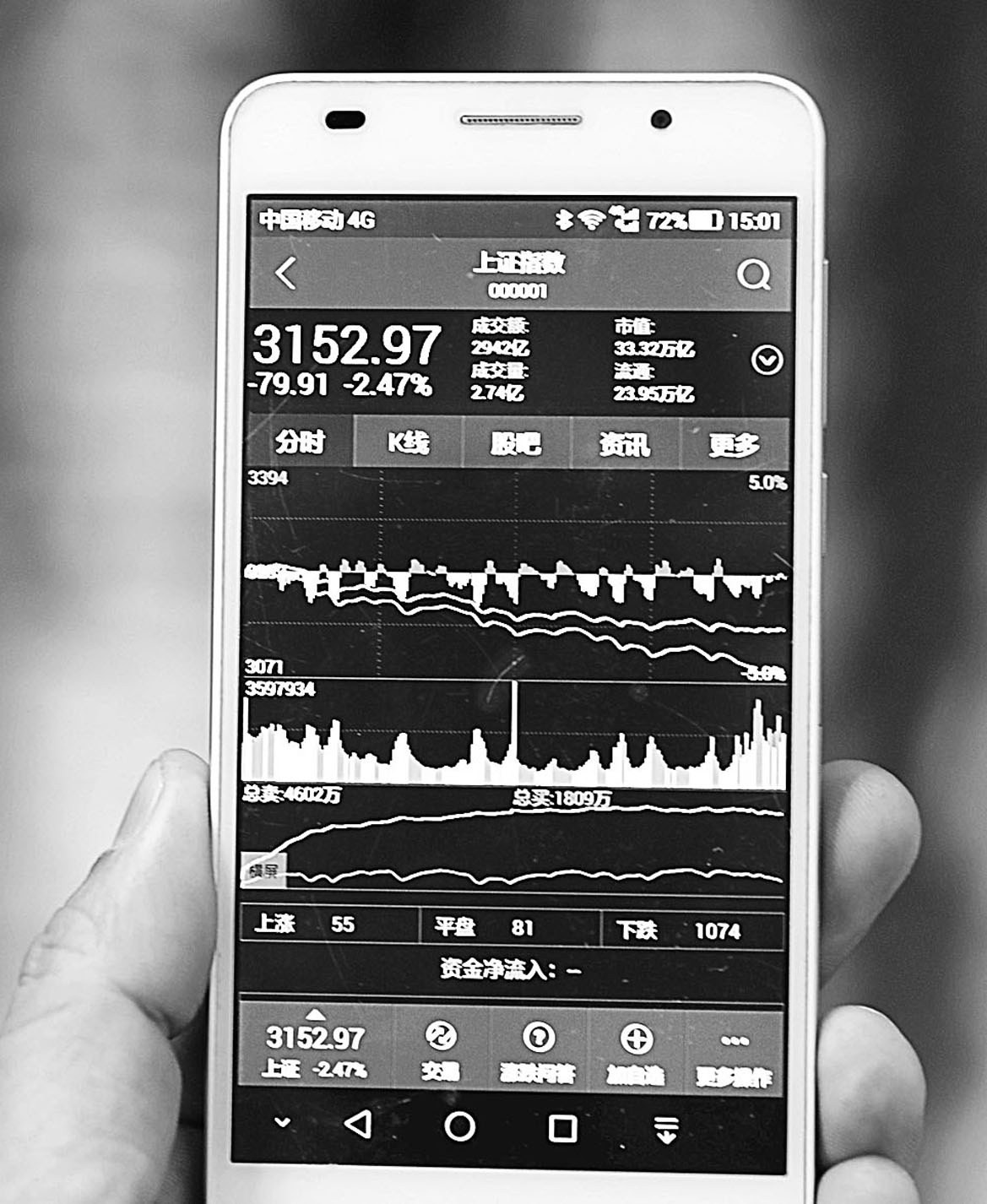 12日,受到利空消息影响,沪深股市低开低走,上证综指失守3200点。图为安徽省淮北市一股民通过手机软件关注股市行情。