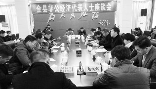 【本报曲靖讯】日前,由云南省罗平县工商联组织筹备的罗平县非公经济代表人士座谈会举行,罗平县委副书记、县长海建才出席会议,通报了该县经济社会发展情况并作重要讲话。县委副书记李四荣主持会议。县政府、县人大、县政协联系非公经济的负责人参加会议。会上,26家罗平本地企业和9家外来企业代表以及昆明市罗平商会的代表,针对企业自身存在的困难问题、县直各部门在服务非公经济发展方面存在的不足以及对县委、政府的工作建议等方面畅所欲言,提出了50多条建设性意见建议。会议还发放了测评表,对县直部门进行了测评。