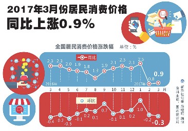 国家统计局12日公布数据,2017年3月份,全国居民消费价格总水平同比上涨0.9%。同时公布的3月份PPI数据显示,PPI环比上涨0.3%,涨幅比2月份回落0.3个百分点,涨幅连续三个月回落。