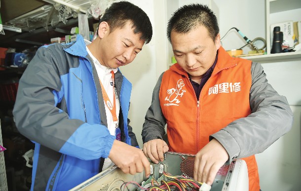在移动互联网时代,传统行业借助“互联网+”纷纷转型升级。餐饮行业有了外卖APP,出租车司机有了叫车软件……宁夏阿里修网络科技有限公司的创始人马少雄则希望通过网络平台解决百姓生活维修难题,在用户和维修师傅之间搭建起联通的桥梁。图为在宁夏银川市阿里修兴庆区服务站,马少雄(左)正查看员工如何维修电脑。李然/摄