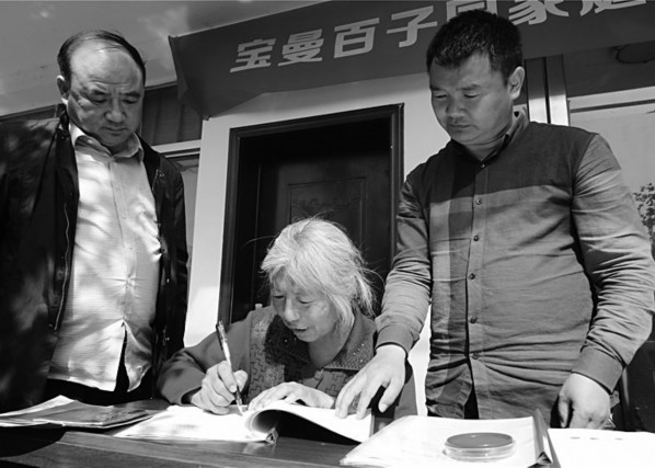 在宝曼百子园家庭农场精准扶贫分红仪式上,还有4家贫困户和李秀粉一样拿到了家庭农场的分红,并签订了常期在农场务工协议。