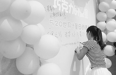 5月20日,在中国石化湖北石油举办的“质量提升计量惠民”宣传活动现场,人们纷纷在“巧克力的重量——520世界计量日的表白”签名墙上,用计量单位表达爱。