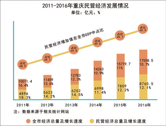 2016年,重庆民营经济实现增加值8760.5亿元,增长12.1%,高出全市GDP增速1.4个百分点;民营经济增加值占GDP比重49.9%,比上年提高0.2个百分点,再创直辖以来新高。民营经济对全市经济增长的贡献率达59.2%,较2015年提高3.5个百分点;带动经济增长6.3个百分点,较2015年提高0.2个百分点,稳增长作用持续增强。