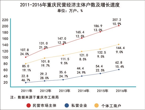 截止2016年底,重庆民营经济市场主体达207.2万户,同比增长10.9%,占全市市场主体的96.6%。其中私营企业达到62.8万户,增长15.4%;个体工商户达到144.4万户,增长9%。值得注意的是,全市私营企业实现大幅增长,增速从2011年起连续6年领先个体工商户,占全市民营经济市场主体的比重也从2011年的21.2%提升到2016年的30.3%,市场主体结构进一步优化。