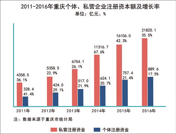 截止去年底,重庆民营经济注册资本金达到22709.7亿元,增长34.7%。其中,私营企业注册资金达21820.1亿元,增长35.5%。个体工商户注册资金889.6亿元,增长17.5%。2010至2016年,私营注册资本年均增长96%。