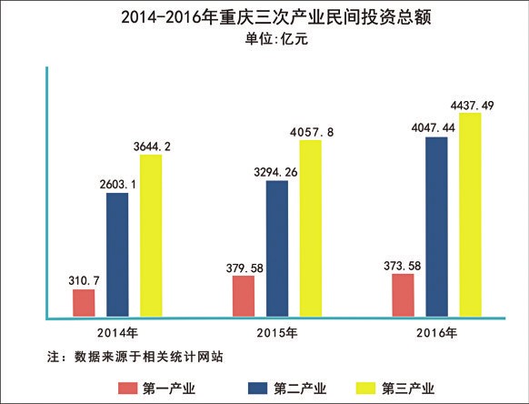 2016年,重庆民间固定资产投资完成8858.5亿元,占全市固定资产投资总量的51%。全市民间固定资产投资同比增长11%,略低于全市固定资产投资增速。从投资领域看,2016年全市民间投资中三次产业结构比例为4.2:45.7:50.1,第三产业仍是民间投资的重头,比上年增长9.4%;第二产业民间投资较2015年增长22.9%,民营企业对制造业发展的信心不断增强。