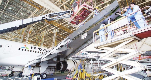 近年来,福建厦门积极打造高水平的航空维修基地,聚集了以厦门太古飞机工程有限公司为代表的13家航空维修企业。2016年,厦门航空维修业产值达121.1亿元。图为太古飞机工程有限公司员工在维修一架国外航空公司飞机。