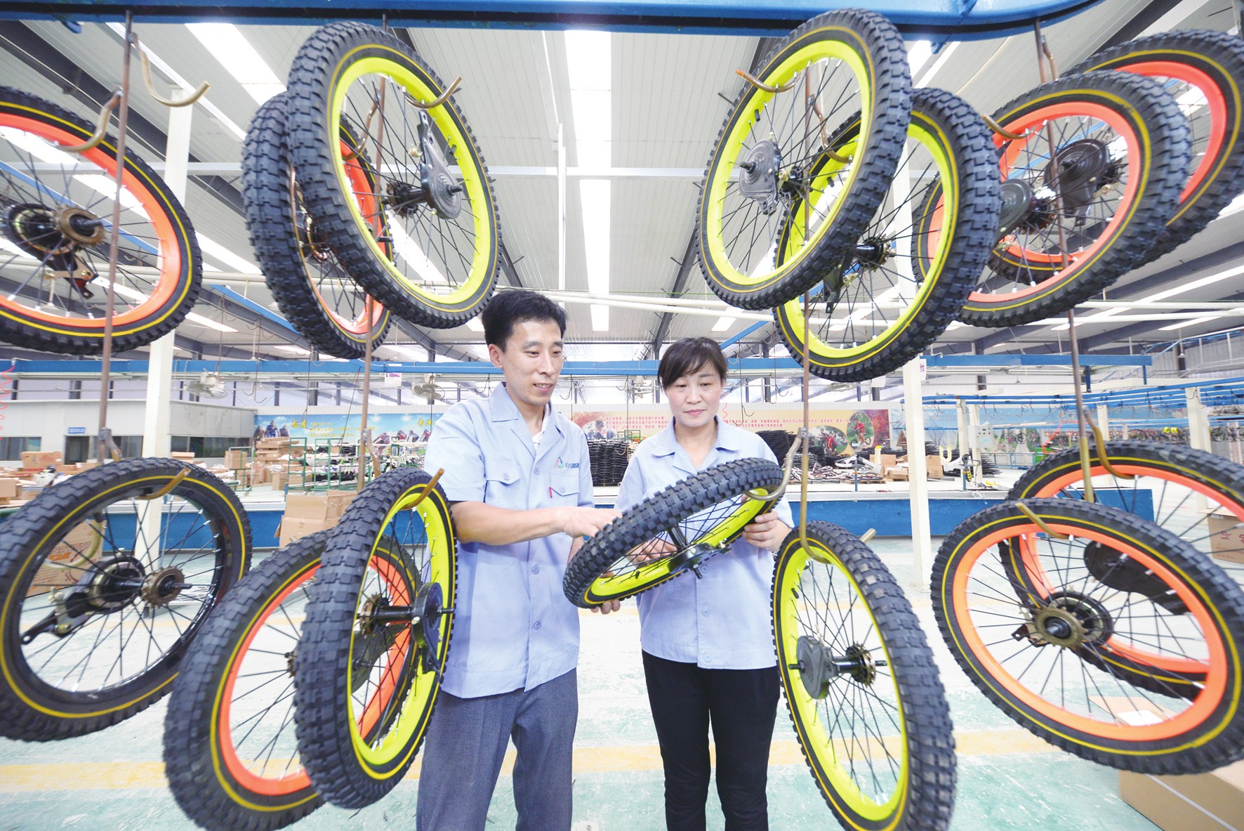 河北省曲周县有着30多年的自行车生产史。目前,拥有自行车、童车、电动车及配件生产企业1800多家,年生产自行车、童车、电动车整车2500万辆。随着“一带一路”倡议的推进,曲周自行车产业迎来新的发展机遇。近两年来,产业规模快速壮大,目前该县获得进出口自营权的童车自行车企业有15家,产品远销欧美和东南亚等地区,年产值约30亿元。图为河北省曲周县一自行车生产企业员工在检查轮胎质量。