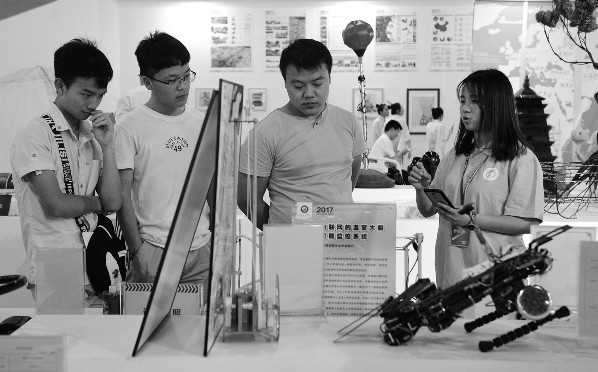 日前,首届西安·雁塔大学生青春设计博览会暨青春飞扬创业节在西安绿地笔克国际会展中心开幕,来自雁塔区19所高校的学子们展出平面设计、工业设计、建筑设计、科技设计及工业美术五大类2500余件优秀作品。雁塔区人社、科技、工商、税务等部门现场办公,集中宣传解读省、市、区创业贷款、专利申请、企业注册、税收减免、创业补贴、创业明星奖励等多项创业创新扶植政策,多方支持想创业、敢创业、能创业的大学生成功转化创新项目。图为西安文理学院学生(右一)在为参观者介绍温室大棚智能监控系统。刘潇/摄