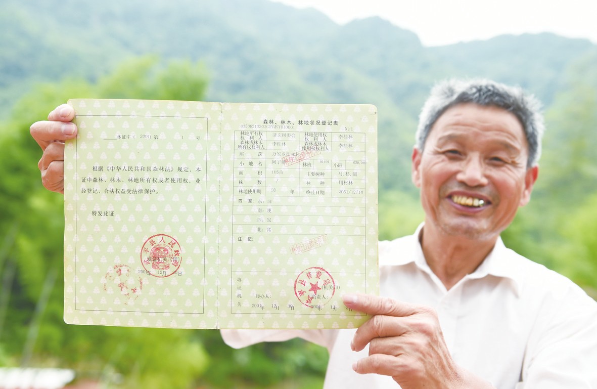 2002年,福建在全国率先开展了集体林权制度改革。十几年来,福建省调动广大林农和社会各界经营林业的积极性,推动森林资源“增量扩面”,目前全省森林覆盖率达到65.95%。图为福建武平县万安镇捷文村村民李桂林在展示林权改革后领到的林权证。林善传/摄