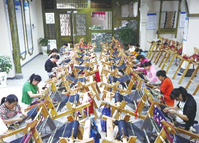 在著名旅游胜地湖南张家界,土家织锦已成为当地特色旅游商品的一张响亮名片,备受中外游客青睐。近年来,当地在保护、传承和发展这一国家级非遗技艺的同时,根据顾客需求不断开发出二维码、汽车挂件、手提包、婚礼服饰、风光壁挂等近百种“私人定制”产品,不仅走俏当地旅游市场,还出口到泰国、马来西亚、韩国、美国等30多个国家和地区。图为工人在湖南张家界市武陵源区乖幺妹土家织锦基地织锦。