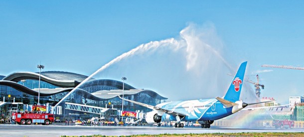 由南航新疆分公司引进的波音787“梦想客机”落户乌鲁木齐地窝堡国际机场,该新型宽体客机7月起正式投入“一带一路”航线,运营乌鲁木齐至喀什、北京、上海航线,连接国内重要支点城市,为新疆联通中亚、欧洲等国际航线提供运力补充。波音787“梦想客机”在乌鲁木齐地窝堡国际机场举行的接机仪式上经过水门。