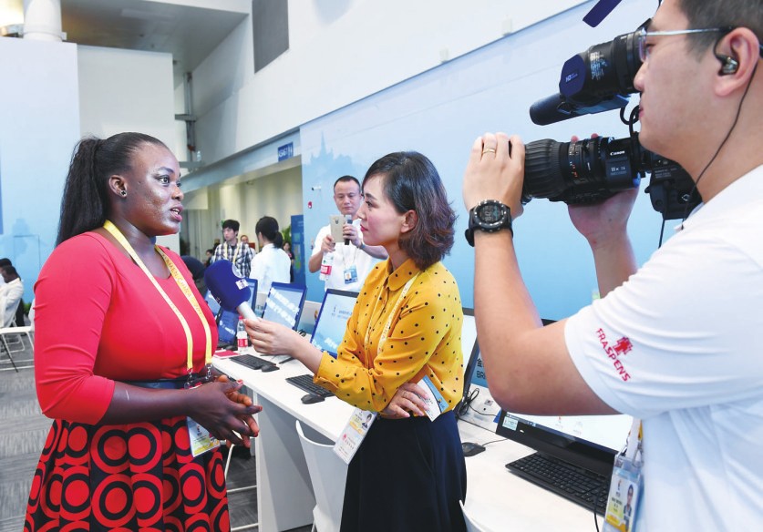 9月3日至5日,金砖国家领导人厦门会晤在福建省厦门市举行,约3000名中外记者前来采访。图为一名来自非洲的记者在新闻中心接受福建媒体记者采访。张国俊/摄