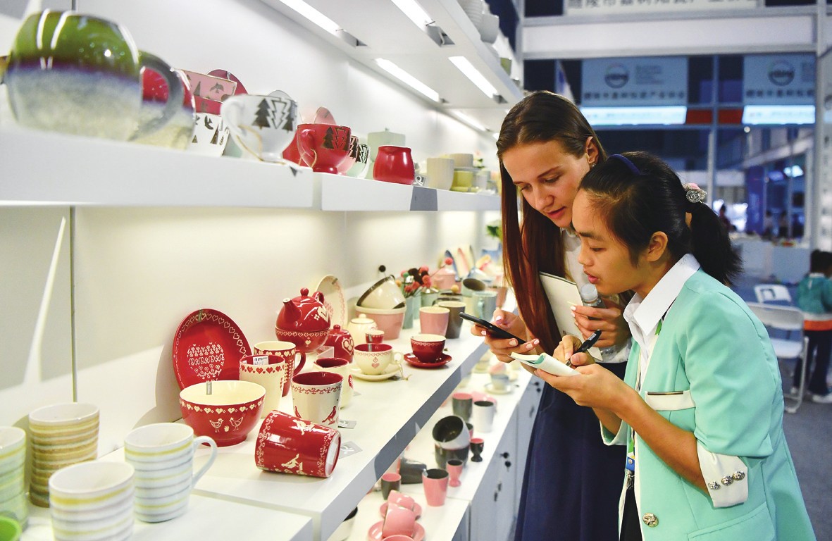 日前,2017中国醴陵国际陶瓷产业博览会在湖南醴陵举办。此次博览会吸引了来自二十多个国家和地区的500余家企业(个人)参展。图为来自俄罗斯的采购人员在向参展商户询问瓷器订购事宜。