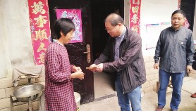 当天,在漆店村倒龙组,贫困户冯伦进爱人漆德清从安徽省工商联宣教处处长周来手中接过慰问金时连声说:“谢谢、谢谢”。冯伦进家是典型的因病致贫,他长期患高血压、爱人又患乳腺癌。为了帮助他脱贫,县、乡扶贫干部采取了一系列措施:全家享受乡村医生签约服务、享受特色种养殖奖补、代售农产品、光伏分红……为了进一步帮扶,安徽省工商联还安排周来和冯伦进结对共建。