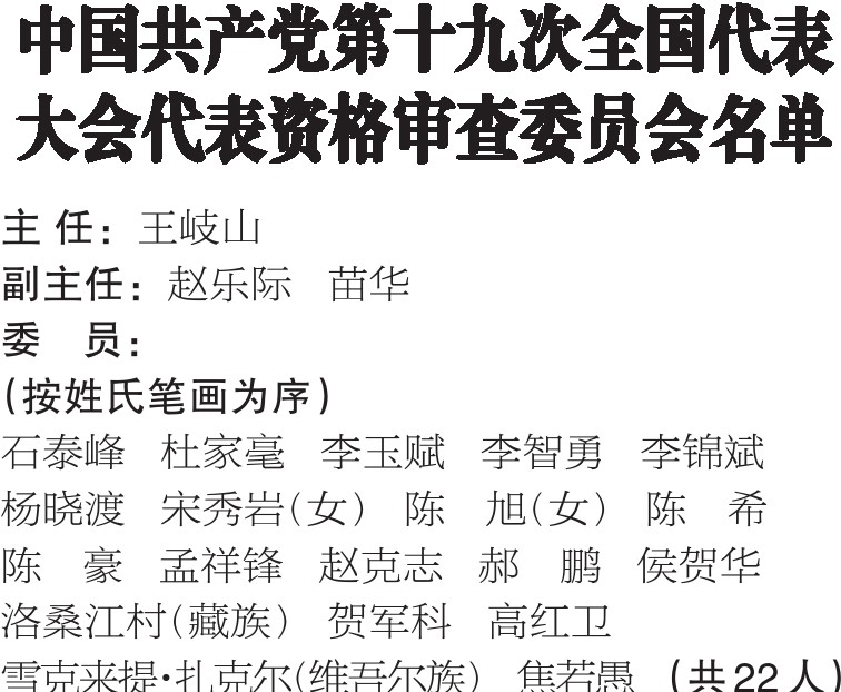 中国共产党第十九次全国代表大会代表资格审查委员会名单