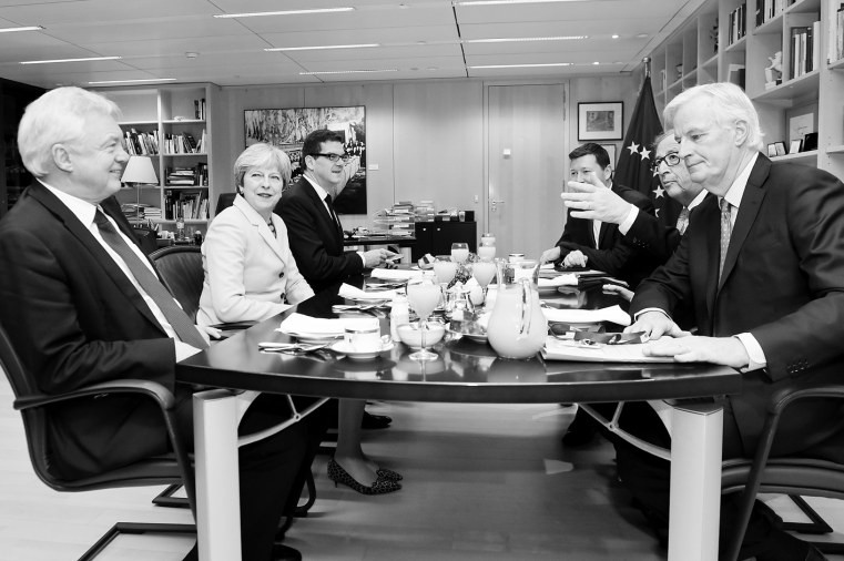 英国首相特雷莎·梅(左二)8日清晨抵达布鲁塞尔与欧盟委员会主席容克(右二)举行一周内的第二次“脱欧”会谈,双方就爱尔兰边界、欧盟在英公民权利、“分手费”等核心议题取得一致,这标志着双方即将开启第二阶段谈判。