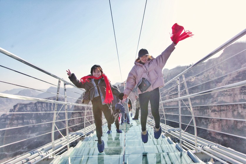 12月24日,位于河北省平山县红崖谷景区的悬跨式玻璃桥正式开放。该桥全长488米,宽4米,桥面与地面垂直落差约218米,可容纳600人同时通过。图为游客在河北省平山县红崖谷景区悬跨式玻璃桥上体验。