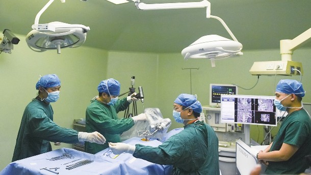 近日,位于安徽合肥的安徽医科大学第一附属医院启用骨科手术机器人开展手术。据介绍,这款名为“天玑”的国产骨科手术机器人由机械臂主机、光学跟踪系统、主控台车构成,能够进行四肢、骨盆骨折以及脊柱全节段(颈椎、胸椎、腰椎、骶椎)手术。图为在安徽医科大学第一附属医院的手术室内,骨科手术机器人辅助医生进行手术。