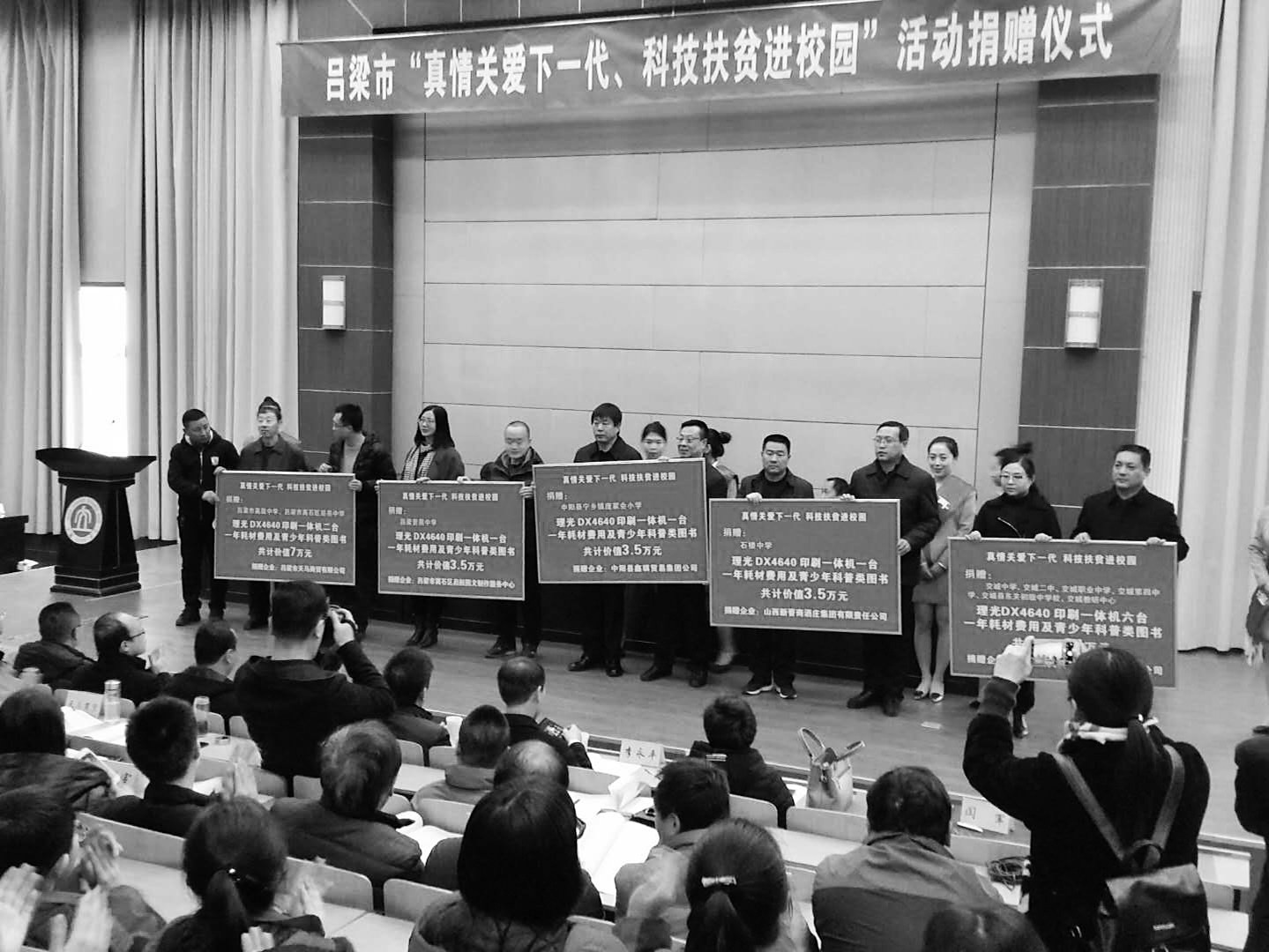 由山西省吕梁市工商联主办的民营企业“真情关爱下一代、科技扶贫进校园”活动捐赠仪式日前举行。山西省科技扶贫促进会为交城县、中阳县、石楼县、离石区四个贫困县的11所学校各捐赠1台价值9.8万元印刷一体机,由山西聚义实业、中阳鑫琪贸易、山西新晋商酒庄、吕梁天马商贸、离石启航图文五户企业出资,为11所学校每校捐赠一年2.5万元的耗材和1万元的科普图书,总计146.3万元。