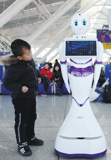 近日,一台集合人机交互、人工智能、大数据等多项新技术的问询机器人“小路”亮相山东青岛北站候车室,为旅客提供车次、检票口、餐饮、问路指引等多项语音问询及查询服务,为春运中的旅客带来便利。图为旅客通过问询机器人“小路”查询信息。