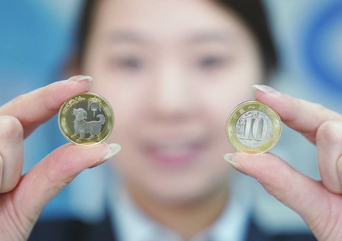 近日,由中国人民银行发行的狗年纪念币开始兑换,纪念币材质为双色铜合金,面额10元,发行数量3.5亿枚。图为在中国建设银行北京宣武支行营业部,一位工作人员展示狗年纪念币。
