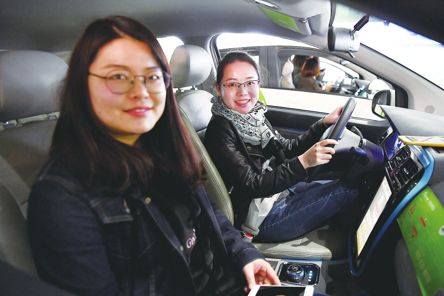 广铁集团为服务旅客出行“最后一公里”,在2018年春运期间推出“高铁+共享汽车”便民举措。通过在广州南站提供新能源车位、搭建互联网平台和增添智能化的停车设施,引入共享汽车服务,为旅客提供更加便捷、高效的出行体验。据介绍,广州南站目前设有1100多个车位,主要用于共享汽车调拨和保养。图为来广州游玩的两名湖南游客在广州南站租用共享汽车后准备去往长隆欢乐世界。