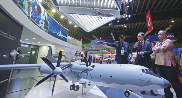 两年一度的新加坡航展于2月6日至11日举行,其中前四天为交易日,最后两天向公众开放。图为新加坡航展上,人们在中航技进出口有限责任公司展位参观。