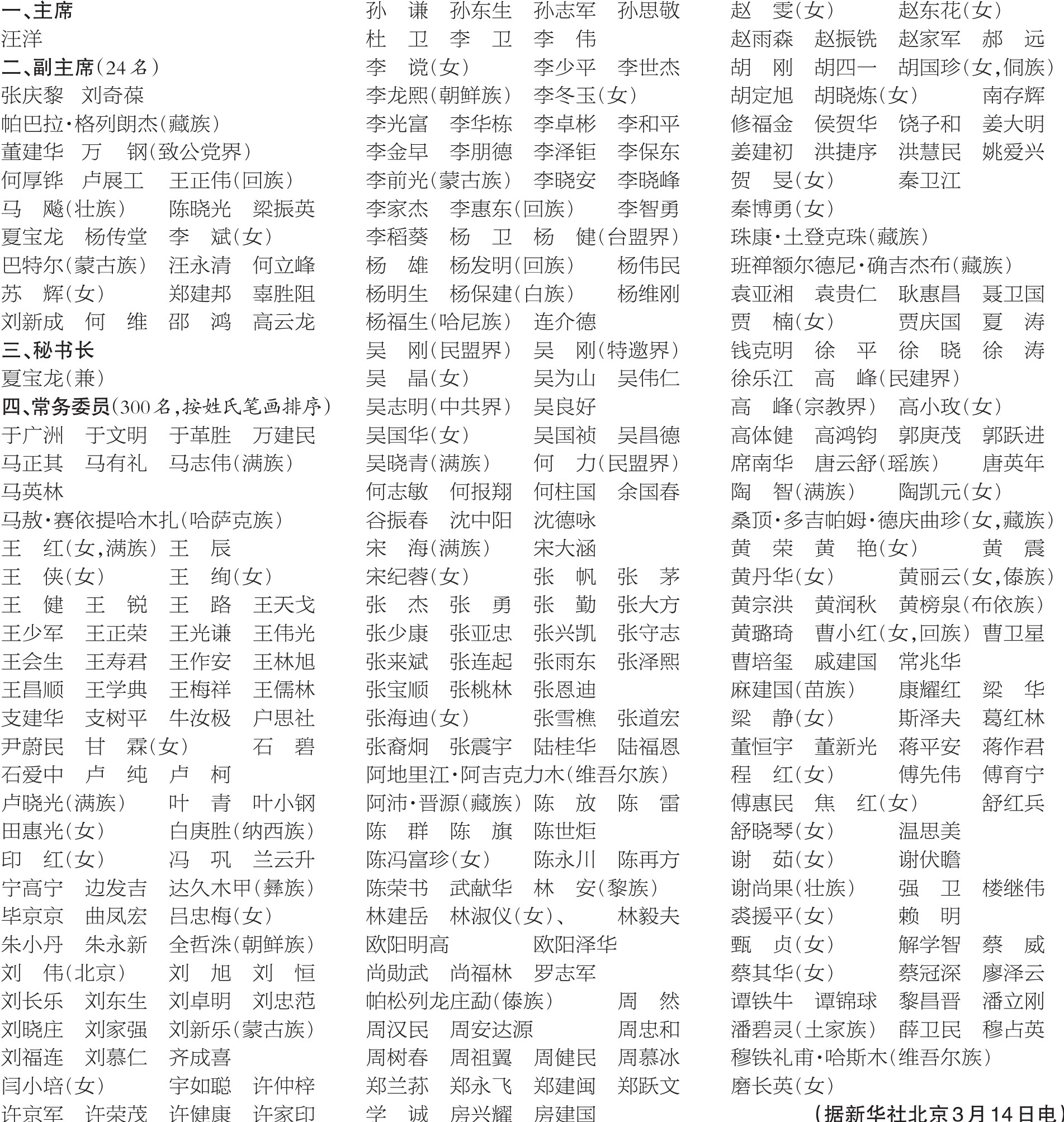 中国人民政治协商会议第十三届全国委员会主席、副主席、秘书长、常务委员名单