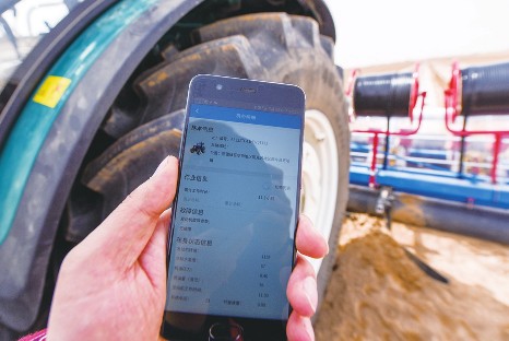 眼下,新疆春耕生产正全面开展。记者在采访时看到,在库车县牙哈镇的一片棉田里,耕地、平地、播种等作业全部由搭载自动导航系统的“智能拖拉机”来完成,大大提高了拖拉机作业的标准化,有助于棉农节本增效。图为在新疆库车县牙哈镇的一处棉田,技术人员通过农机APP检测“智能拖拉机”的运行状态。