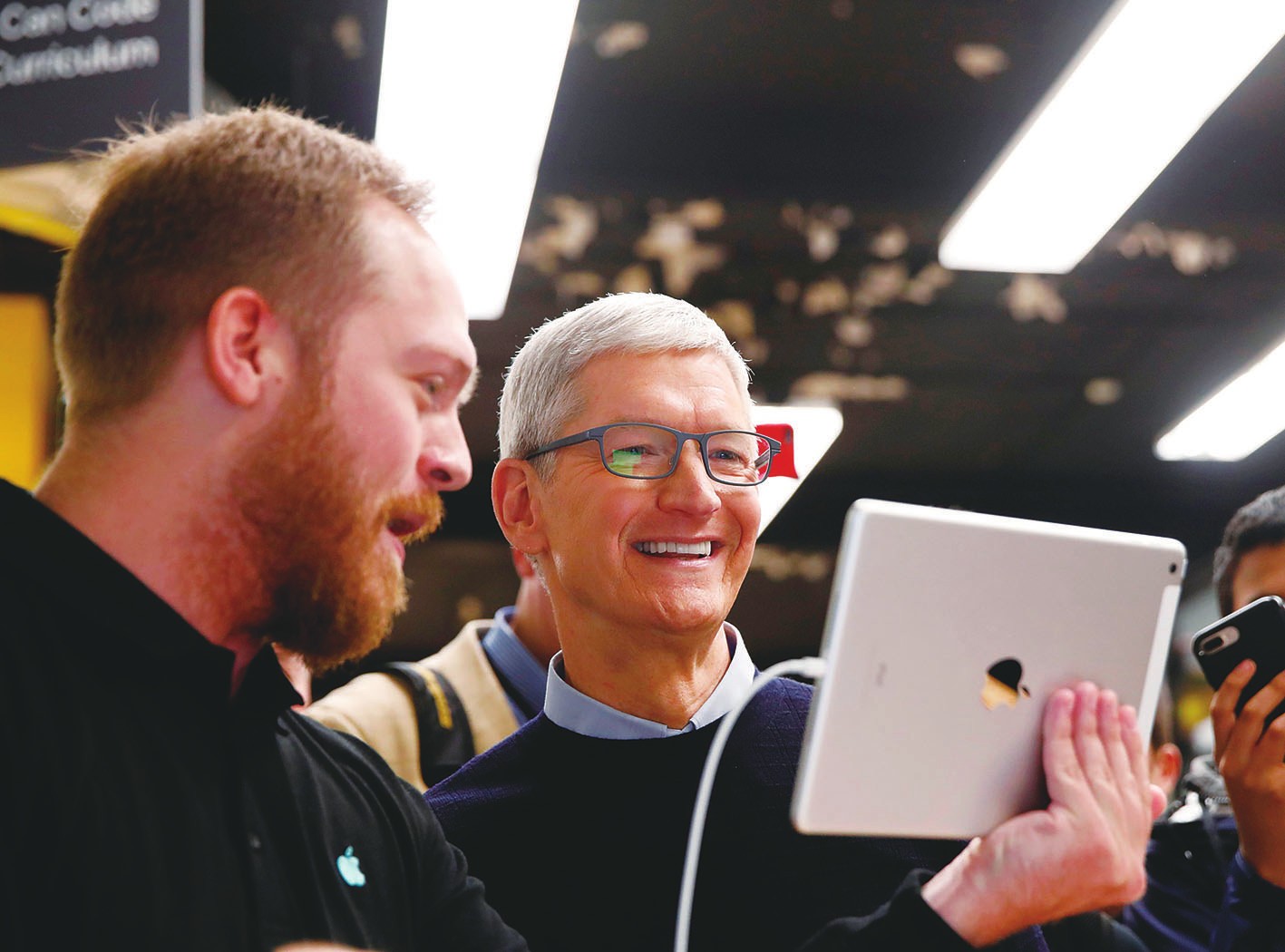 美国苹果公司27日在芝加哥发布支持Apple Pencil,性能更出色的新款iPad。图为苹果公司首席执行官蒂姆·库克(右)观看新款iPad。