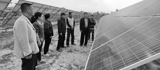 2016年以来,河北省巨鹿县积极探索光伏产业扶贫新路,采用“政府+企业+金融机构+贫困户”的合作模式,利用贫困村内的闲置荒地、盐碱地、坑塘,建立了65个村级光伏扶贫电站。目前,巨鹿县村级光伏扶贫电站全部实现并网发电,涉及贫困户3800余户,人均年增收3000余元。图为,河北省巨鹿县阎疃村党支部书记阎世华(右二)在为村民讲解光伏惠民政策。