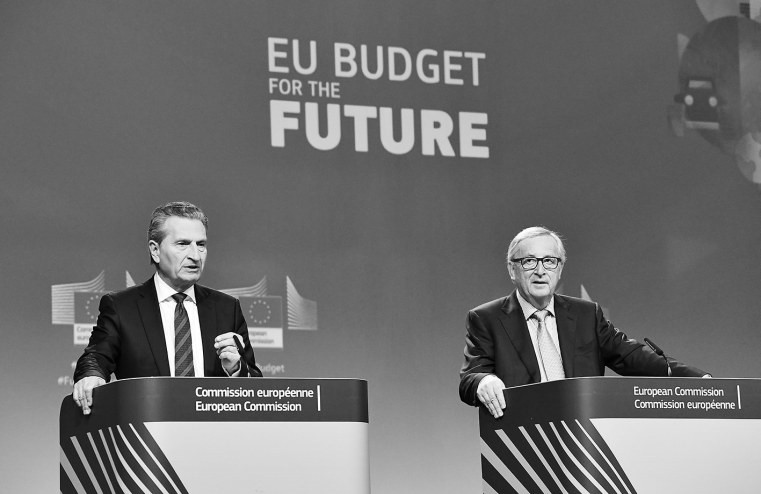 欧盟委员会日前发布欧盟2021年至2027年财政预算提案,旨在通过减少农业领域支出和团结基金等方式填补英国“脱欧”后留下的预算空白。图为欧盟委员会主席容克(右)和欧盟委员会负责预算的委员京特·厄廷格在比利时布鲁塞尔出席新闻发布会。