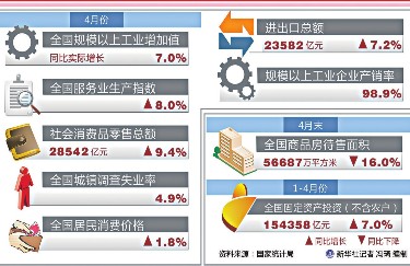 从需求来看,消费、投资增速略有回落,外贸增速由降转升。4月份,社会消费品零售总额同比增长9.4%,增速比上月回落0.7个百分点。1至4月份,全国固定资产投资同比增长7%,增速比1至3月份回落0.5个百分点。4月份,进出口总额同比增长7.2%,上月为下降2.5%。