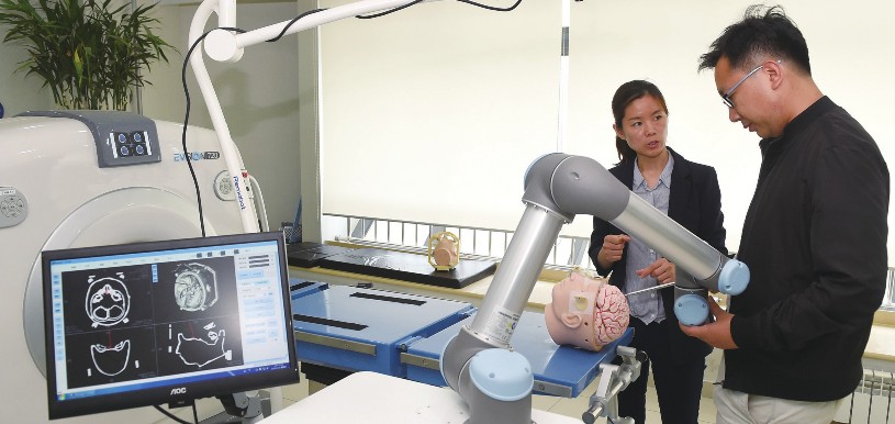 (图)中关村企业北京柏惠维康公司所研制的神经外科手术机器人在行业内占据领先地位。图为公司的工作人员在调试神经外科手术机器人。罗晓光/摄