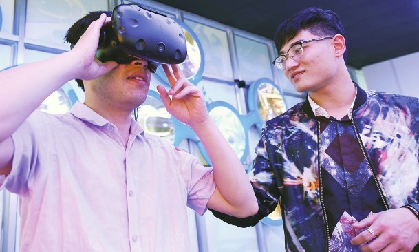 近年来,位于黄河三角洲的山东省高青县积极进行新旧动能转换,投资4.9亿元改建厂房建设物联网产业园。目前这个园区已建成850个座席的呼叫中心,承接了多个知名公司的客服业务,解决300余人的就业问题。图为一名客户在产业园内体验虚拟现实技术。