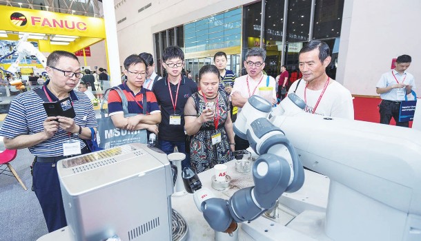 近日,2018中国(武汉)国际自动化与机器人展览会在武汉国际博览中心开幕。此次展览展出面积20000平方米,吸引全球知名品牌参展企业约300家。图为参观者在展会上参观咖啡机器人。