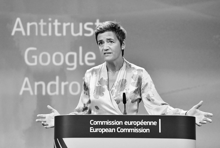 欧盟委员会日前宣布,由于谷歌采取“非法限制措施”以加强其在搜索引擎方面的主导地位,违反了欧盟反垄断规则,欧盟委员会决定对谷歌处以43.4亿欧元罚款。负责竞争事务的欧盟委员玛格丽特·韦斯塔格召开新闻发布会。新华社/法新