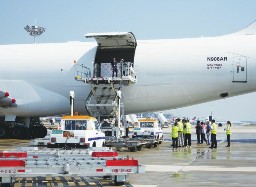 近日,来自加拿大的100吨波士顿活龙虾搭乘波音747货运专机降落在长沙黄花国际机场,标志着湖南省首条定期洲际全货机航线——长沙-北美定期洲际全货机航线首航成功。航线开通后,每周将有3班包机往返于长沙与北美之间,将大大缩短湖南与北美之间的货物运输时间,降低运营成本。图为机场工作人员准备卸下货运专机上的货物。张笑宇/摄