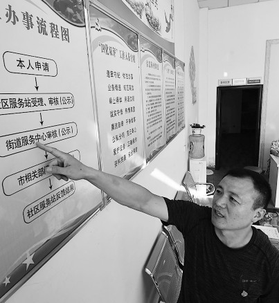 “有事找村里,办事不出村”,在河南邓州,“大数据”撬动了农村治理方式的改革,改写着农民生活。图为在河南省邓州市花洲街道办事处中州家园社区为民服务大厅,工作人员介绍网上办事流程图。