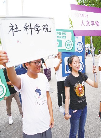 22日,3800余名2018级新生来到清华大学报到,开启大学生活。据介绍,清华大学今年录取的新生包含国际学生300余人,港澳台学生50余人,内地学生3400余人。图为在清华大学迎新点,老生举着院系牌子迎接新生入学。