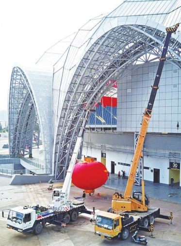 为迎接宁夏回族自治区成立60周年,宁夏银川市陆续在城市主干道、贺兰山体育场、城市公园等地布置各色花卉及灯笼等装饰,处处鲜花盛开,洋溢着喜庆的氛围。图为工人在贺兰山体育场吊装红灯笼。
