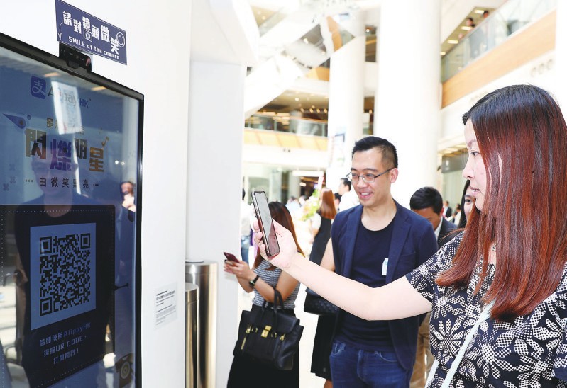 5日,香港首家AlipayHK(支付宝香港版)无人零售商店在九龙区奥海城开业。商店占地约370平方米,售卖多款时尚精品、服饰等,还引入一台智能机械臂,为顾客现场冲调香浓咖啡。图为人们在无人零售商店进行体验。李钢/摄