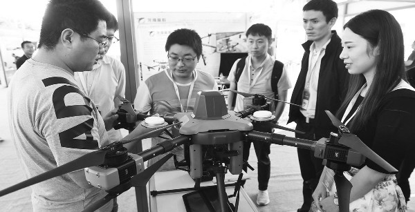 9月10日,2018全球无人机大会在成都开幕。大会同期举办的无人机展览共展出各类无人机产品70余架,吸引40余家厂商前来参展。图为观众在参观展出的无人机。