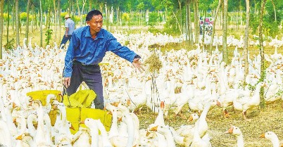 近年来,河北大城县充分发挥林地资源优势,推动林下经济规模化、产业化、集约化发展,引导村民发展林下养殖产业,促进农林牧各业资源共享、优势互补,形成良性立体化生态循环体系,有效提高村民收入,加快推进乡村振兴战略步伐。据了解,该县林下经济年总产值达到2000余万元。图为,河北大城县昌泰苗圃种植农民专业合作社的养殖户在给“大三花”鹅喂食。
