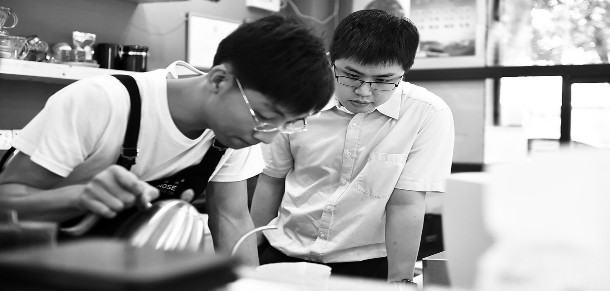 在深圳一座高约300米的大厦里,一家咖啡体验店刚刚开业。这是台湾青年吴森胜在珠三角开的第5家门店。吴森胜有一个身份标签:“台商二代”。他的父亲吴妙根,已在紧邻深圳的东莞开了25年拉链厂。三年前,父亲将儿子叫来广东接手家族生意,没想到抓住商机的儿子,开启了属于自己的创业历程。图为吴森胜(右)指导员工手冲咖啡。