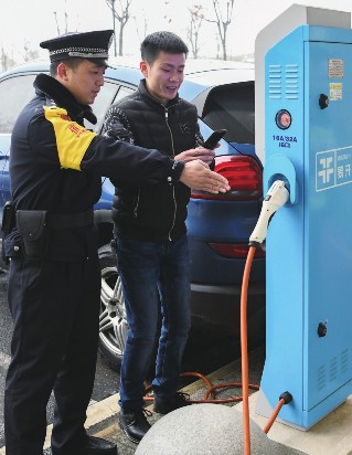 春运期间,湖北省黄冈城际铁路站客流量大。为应对客流高峰,方便旅客出行,武汉铁路公安黄州车站派出所协同当地交通部门,在站场引入电动共享汽车,引导有条件的乘客使用。图为铁路民警在湖北省黄冈城际铁路站引导到站乘客使用共享汽车。