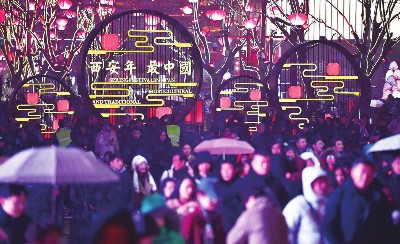 春节假期过后,陕西西安旅游市场持续繁荣,部分景区依旧游人如织。图为游人在西安市曲江新区大唐不夜城步行街游览。